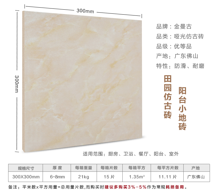 金曼古仿古地磚,采用國際先進的超大型壓機自動成型,經世界一流的滾筒印花和高溫煅燒而成,通過仿石、仿巖、仿木、仿布、仿金屬等多種表現方式,產品花色圖案新穎時尚,領先國際潮流,具有超耐磨、防滑、防污等高性能指標。