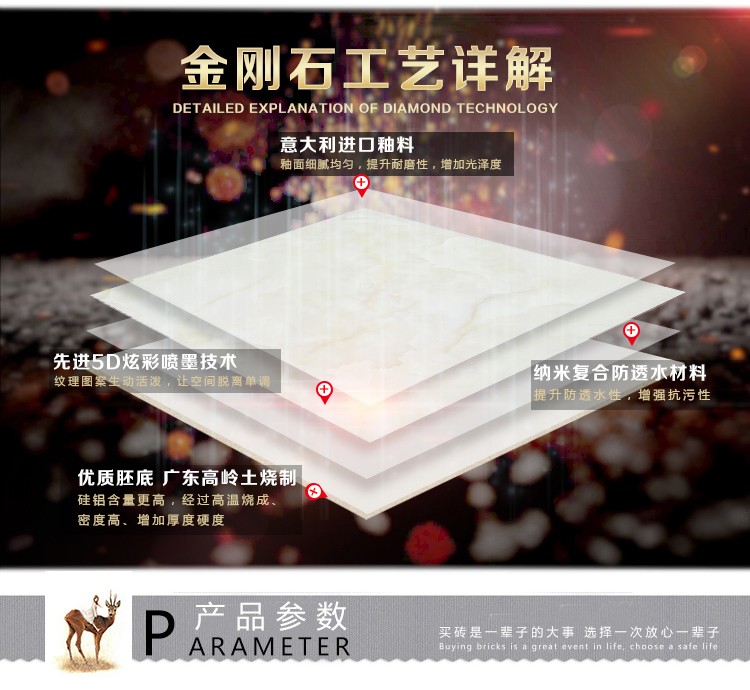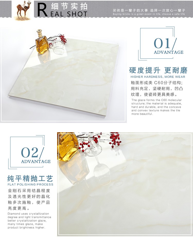 金曼古全拋釉瓷磚運用多層特殊制造工藝,將全透析釉料下彩技術結(jié)合先進印刷工藝,令花紋俯在下層,低碳能源、清潔生產(chǎn),表面光潔剔透,獨有釉料精拋工序,集拋光磚與仿古磚優(yōu)點于一體,釉面如拋光磚般光滑亮潔,同時其釉面花色如仿古磚般圖案豐富,色彩厚重或絢麗。