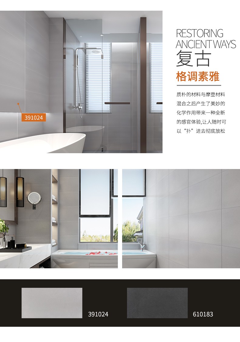 金曼古墻地磚,適用于洗手間、廚房、室外陽(yáng)臺(tái)的立面裝飾,是保護(hù)墻面免遭水濺的有效途徑。它們不僅用于墻面,用在門(mén)窗的邊緣裝飾上,也是一種有趣的裝飾元素。用于踢腳線處的裝飾墻磚,既美觀又保護(hù)墻基不易被鞋或桌椅凳腳弄臟。