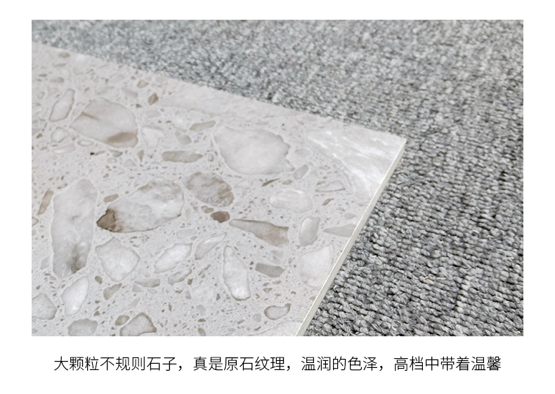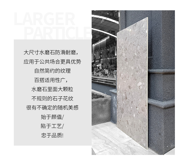 大尺寸水磨石防滑耐磨,應用于公共場合更具優勢,自然簡約的紋理,百搭適用性廣,水磨石里面大顆粒,不規則的石子花紋,很有不確定的隨機美感。始于顏值/陷于工藝/忠于品質!