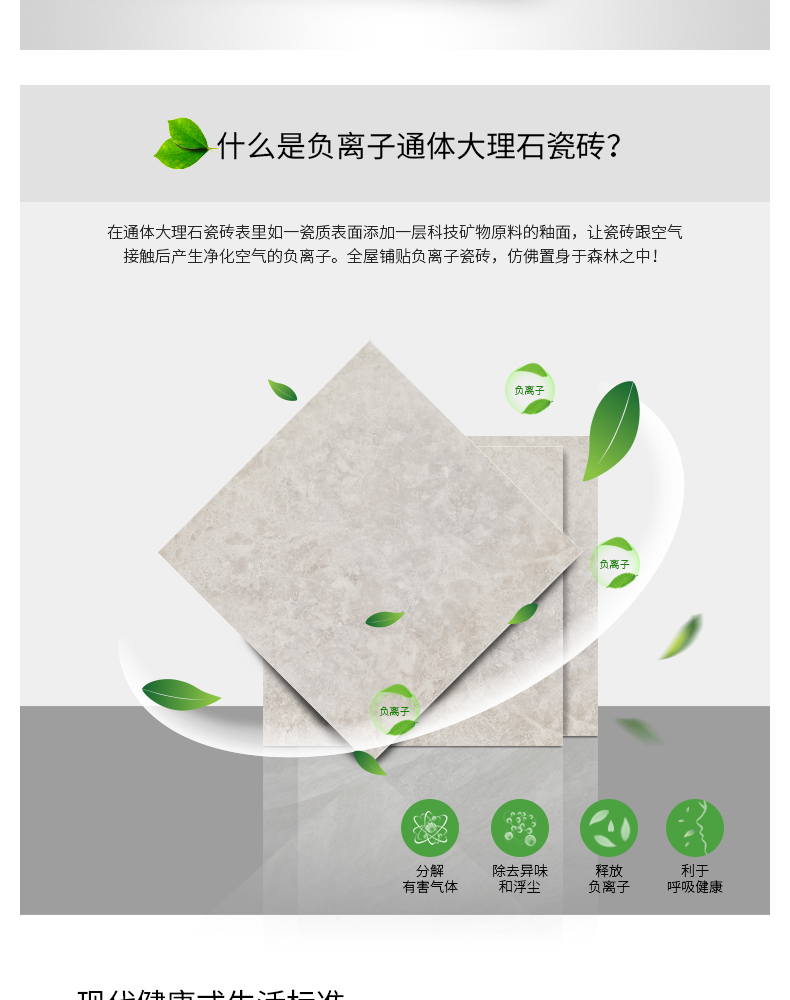 金曼古負離子瓷磚,能持續產生負離子,提高居室內空氣負離子濃度,改善室內空氣質量,提升人體健康水平。負離子被稱為空氣維生素,負離子瓷磚創造安全健康的空間環境。工程用磚全拋釉地磚、通體大理石瓷磚、金剛石地磚等支持加工定做家裝瓷磚批發。