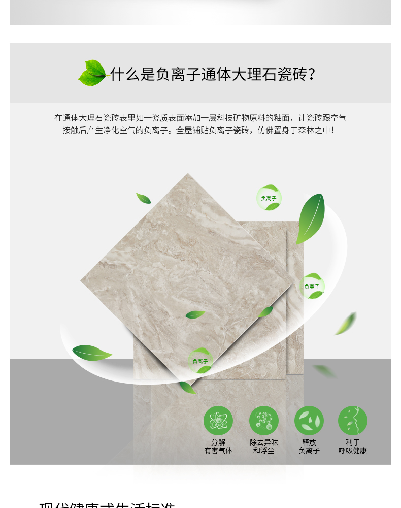 金曼古負(fù)離子瓷磚,能持續(xù)產(chǎn)生負(fù)離子,提高居室內(nèi)空氣負(fù)離子濃度,改善室內(nèi)空氣質(zhì)量,提升人體健康水平。負(fù)離子被稱為空氣維生素,負(fù)離子瓷磚創(chuàng)造安全健康的空間環(huán)境。工程用磚全拋釉地磚、通體大理石瓷磚、金剛石地磚等支持加工定做家裝瓷磚批發(fā)。