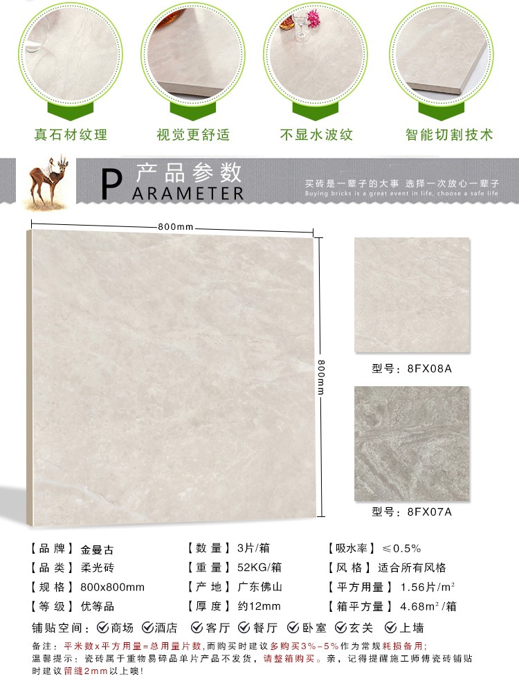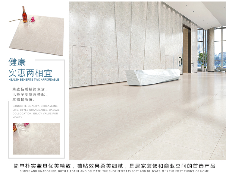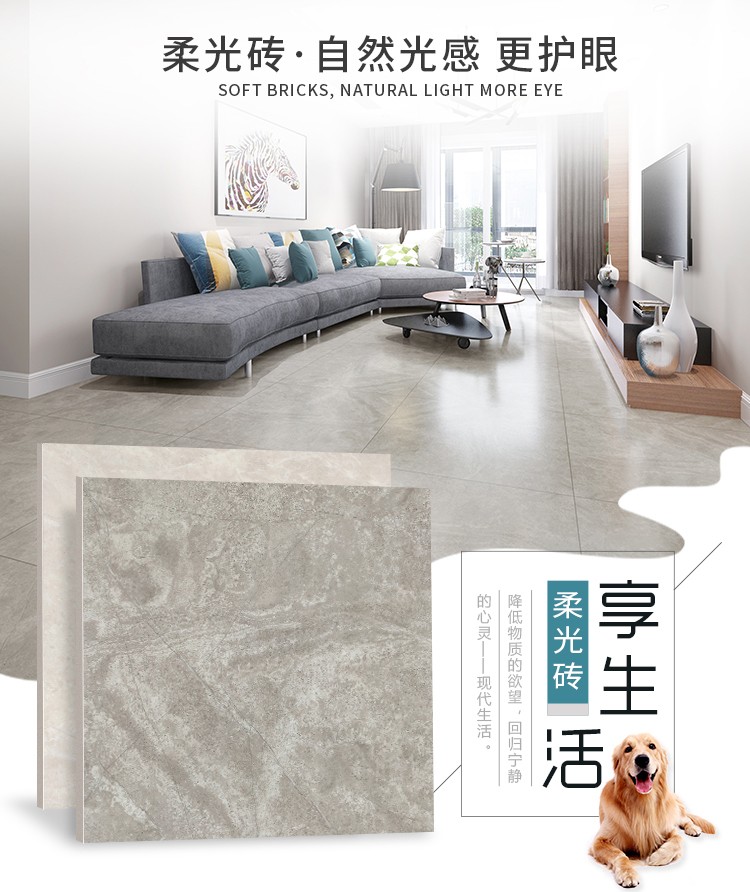 柔光瓷磚是磚面反射介于強(qiáng)光與弱光之間的一類(lèi)瓷磚,其結(jié)合亮光類(lèi)瓷磚的高調(diào)明艷裝飾和啞光類(lèi)瓷磚的低調(diào)內(nèi)斂搭配效果,通過(guò)動(dòng)態(tài)柔光蠟拋技術(shù),降低產(chǎn)品反光率,從而達(dá)到人體舒適的視覺(jué)感受以及無(wú)光污染的空間裝飾效果。優(yōu)點(diǎn):1.視覺(jué)舒適,無(wú)光污染 2.堅(jiān)固耐磨,不易刮花.