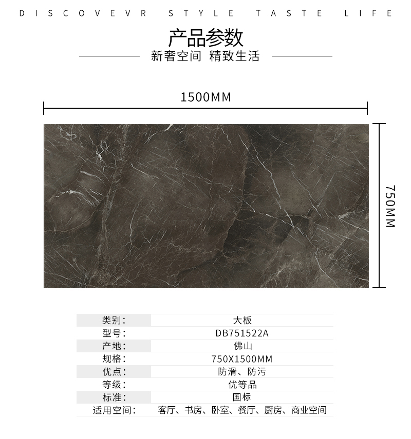 大規格瓷磚(DB751522A)-工程瓷磚 金曼古大規格瓷磚引進世界最先進的超大型壓機自動壓制而成,具有超大規格,超高硬度,超高致密度,超長時間煅燒,超低吸水率,超高光澤度。其磚面紋理流暢自然,效果逼真,適用于大型工程外墻干掛和酒店、商場、各辦公樓大堂等地面裝修