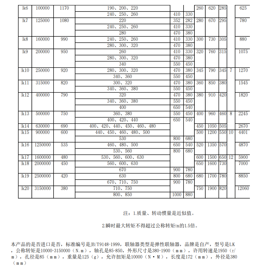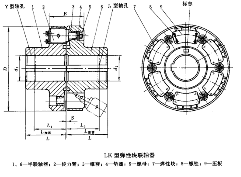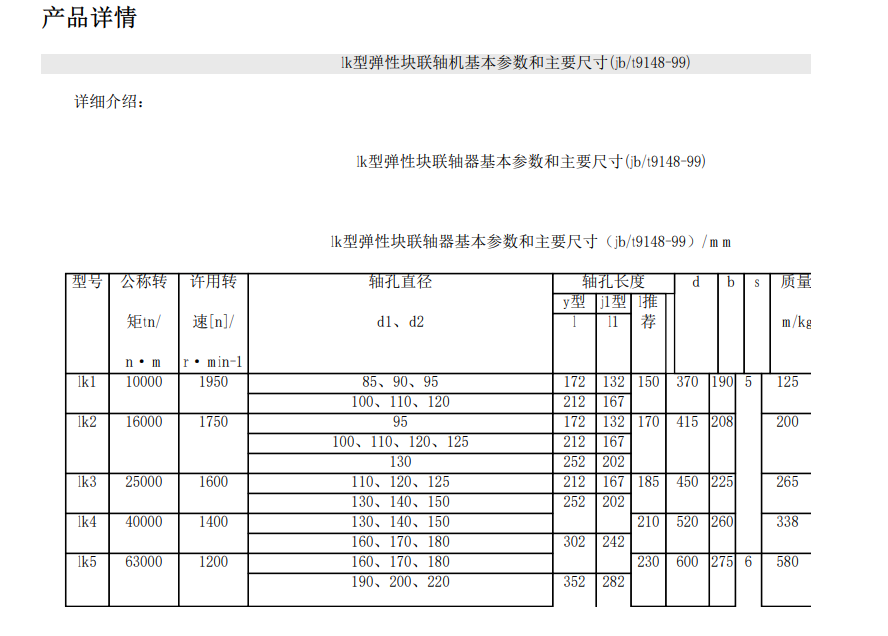 LK彈性塊聯(lián)軸器是以橡膠為彈性元件材料,無扭轉(zhuǎn)傳動間隙,易于現(xiàn)場調(diào)節(jié)剛度的彈性聯(lián)軸器,具有補(bǔ)償兩軸相對偏移以及減振、緩沖性能,節(jié)能,無噪聲,不用潤滑,更換彈性件(易損件)時主機(jī)半聯(lián)軸器用作軸線移動(對于重型機(jī)械設(shè)備此特點(diǎn)尤為重要)。 安裝維護(hù)簡便,使用壽命較長,根據(jù)需要通過改變橡膠配方(主要改變硬度)可以調(diào)整聯(lián)軸器的扭轉(zhuǎn)剛度。適用于聯(lián)接兩同軸線大中功率、振動沖擊較大的軸系傳動,例如冶金機(jī)械、礦山機(jī)械等。原來的標(biāo)準(zhǔn)(ZBJ19029-90)存在外徑尺寸大、質(zhì)量大等缺點(diǎn),改進(jìn)后的新標(biāo)準(zhǔn)(JB/T9148-99代替ZBJ19029-90)新結(jié)構(gòu)不僅保留了減振、緩沖性能好的特點(diǎn),而且縮小了外徑尺寸,減輕了質(zhì)量和轉(zhuǎn)動慣量,提高了許用轉(zhuǎn)速,經(jīng)過幾年的工業(yè)應(yīng)用,優(yōu)點(diǎn)十分明顯,已成原結(jié)構(gòu)的更新?lián)Q代產(chǎn)品。新標(biāo)準(zhǔn)許用轉(zhuǎn)速平均提高28%,**外徑平均縮小36%,轉(zhuǎn)動慣量平均減小70%,質(zhì)量平均減輕57%。